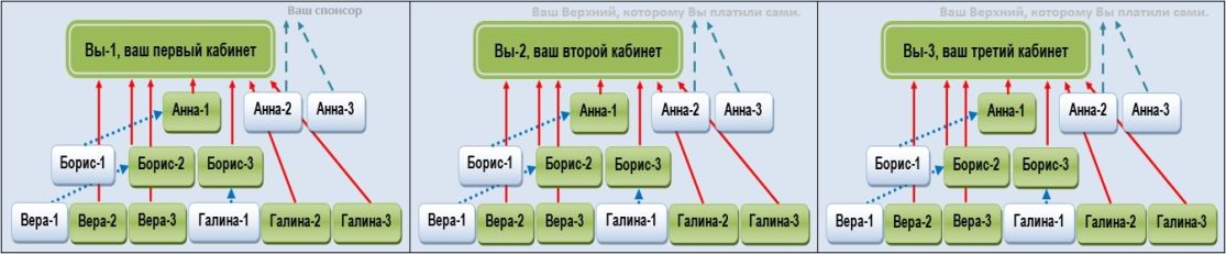 Начинаем с тарифа Start-5 - активируем сразу 3 кабинета, отправив 500 и 1000 руб двум участникам Программы, номера их Карт увидите в кабинетах во время оплаты. Делитесь информацией с тремя заинтересованными людьми и получайте от каждого по 500 руб на свою Карту. С глубины получаем по 200% с каждого - по 1000 рублей. Как только на Вашем кошельке накопится 5.000 рублей - сразу же Активируем по одному все кабинеты следующего тарифа. Построение партнерской структуры должно происходить быстро и равномерно.
